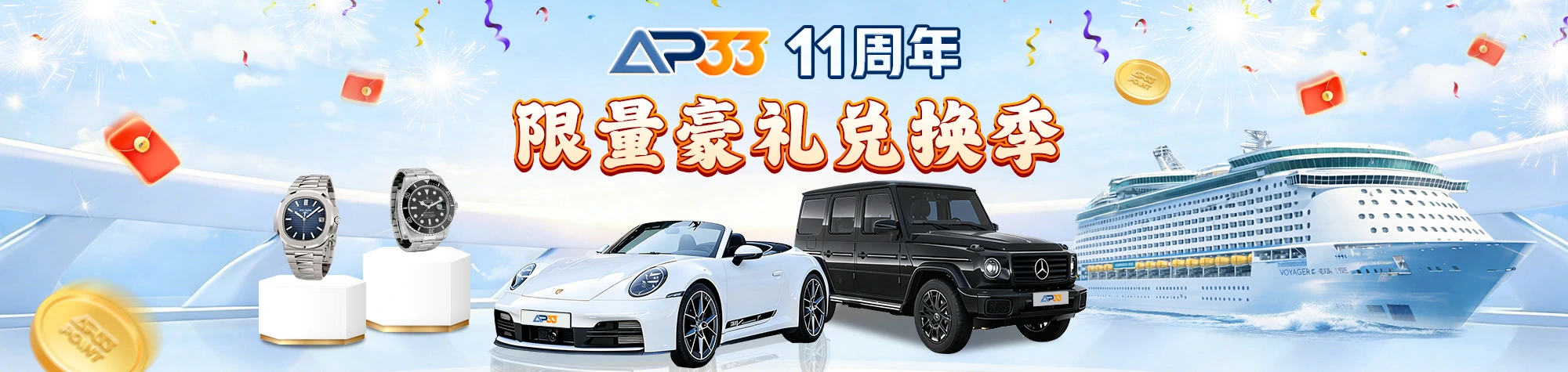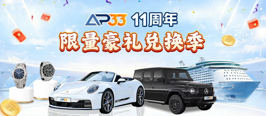11 周年庆 重磅大奖已上线 精彩时刻已到来 · 2026年3月 – 2026年6月30日 AP33 11th Anniversary 45 DAYS 12 HOURS 32 MINUTES 30 SECONDS 活动已结束 参与11周年庆总人数 1000 立即参与 AP33 11周年活动攻略 为庆祝 AP33 平台十一周年,特别抽奖回馈活动!所有会员都有机会赢得丰厚大奖。 奖品池 Porsche 911 Carrera (Coupe) 已参与人数 立即参与 Mercedes-Benz G-Class G580 已参与人数 立即参与 Patek Philippe Nautilus 5711/1A-010 已参与人数 立即参与 RolexSubmariner Date 已参与人数 立即参与 AP33 x Royal Caribbean Cruises (5-night Penang, Phuket & Langkawi) 已参与人数 立即参与 兑换成功后,请留守本页,优胜者名单即将揭晓!